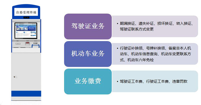 本產品采用優質工藝,集人臉識別、指紋識別、物聯網、深度學習、計算機通信技術及數據庫技術為一體,實現機動車、駕駛證、交通違法等車駕管業務的全流程智能化、自助化。產品部署靈活,真正實現“互聯網+政務服務”為重點的利民便民措施。