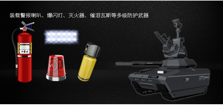 安保機器人裝載警報喇叭、爆閃燈、滅火器、催淚瓦斯等多級防護武器